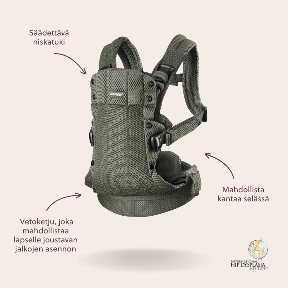 Valmistettu viileästä 3D-verkkokankaasta, joka pitää sekä kantajan että lapsen olon miellyttävänä. Kaikki materiaalit täyttävät OEKO-TEX Standard 100 -sertifikaatin vaatimukset, joten ne ovat turvallisia vauvan herkälle iholle.