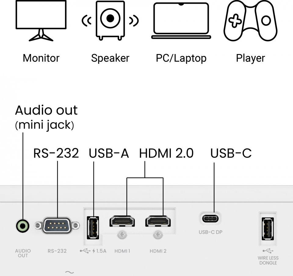 Monipuoliset liitännät: USB-C-portti mahdollistaa vaivattoman yhteyden kannettaviin tietokoneisiin, tableteihin ja älypuhelimiin. Dual HDMI tarjoaa korkealaatuista suoratoistoa ja joustavaa liitettävyyttä muihin laitteisiin. Dual USB Type-A -portit mahdollistavat lataamisen, ja RS232-liitäntä helpottaa useiden projektoreiden keskitettyä hallintaa.