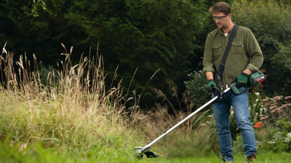 Tehokas 36V:n akkutrimmeri AdvancedGrassCut 36V-33 sopii erinomaisesti koskemattomien nurmikoiden ja umpeen kasvaneiden ruoho- ja rikkaruohoalueiden leikkuuseen.