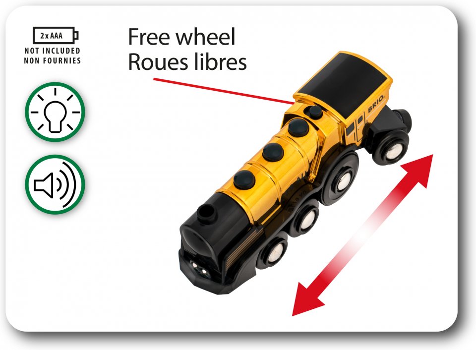 33630 Ison kultaisen veturin kiiltävä kultainen metallimaali ja klassinen ”tuut-tuut” -ääni tekevät varmasti vaikutuksen, kun juna kiitää raiteilla uskomattomalla nopeudella. Paristokäyttöinen lelujuna on yksi BRIO Worldin vahvimmista. Se liikkuu eteen- ja taaksepäin valo- ja äänitehosteiden saattelemana. Veturin päällä on kytkin, jonka ansiosta junaa voi käyttää myös ilman paristoja. Sisältää hienoja metallisia yksityiskohtia. Upea lisä BRIO World -rautatiehen, joka kasvaa ja kehittyy samaan aikaan lapsen kanssa. Todellisuutta muistuttavat junaleikit auttavat lapsia oppimaan ympäristöstään hauskalla tavalla ja kehittävät hienomotorisia taitoja leikin ohella.