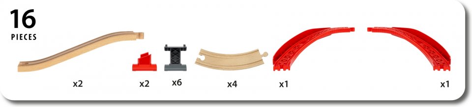 Sisältää kokonaisen radan muodostavat 4 puista kaarevaa rataosaa, 2 puista nousevaa rataosaa, 2 muovista nousevaa kaarrerataosaa ja 6 tukipylvästä. Todellisuutta muistuttavat junaleikit auttavat lapsia oppimaan ympäristöstään hauskalla tavalla ja kehittävät hienomotorisia taitoja.