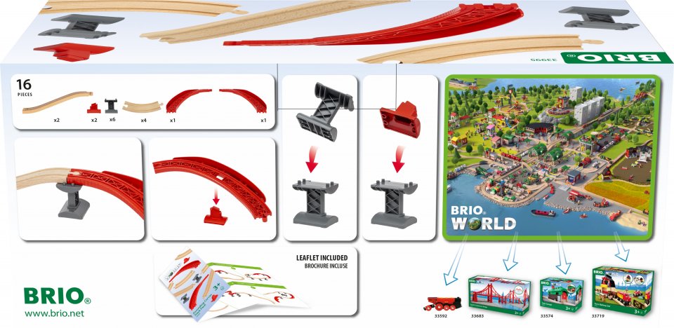 BRIO World 33995 Nousevat kaarteet -ratapaketin mutkaiset, ylös ja alas kulkevat rataosat tuovat junarataan nopeutta, korkeutta ja väriä. Junarataa voi käyttää sellaisenaan suljettuna ratana tai lisätä sillä korkeutta, nopeutta ja hauskuutta BRIO World -junarataan.