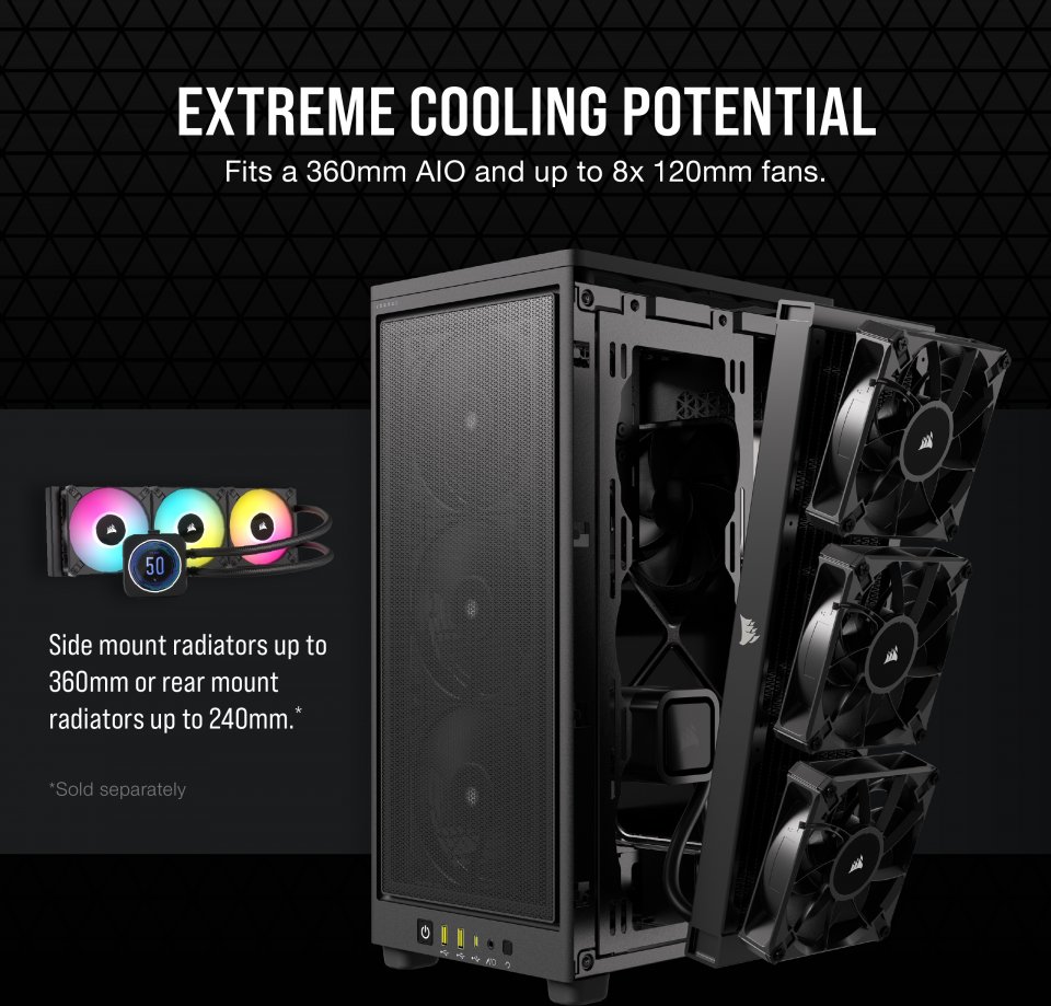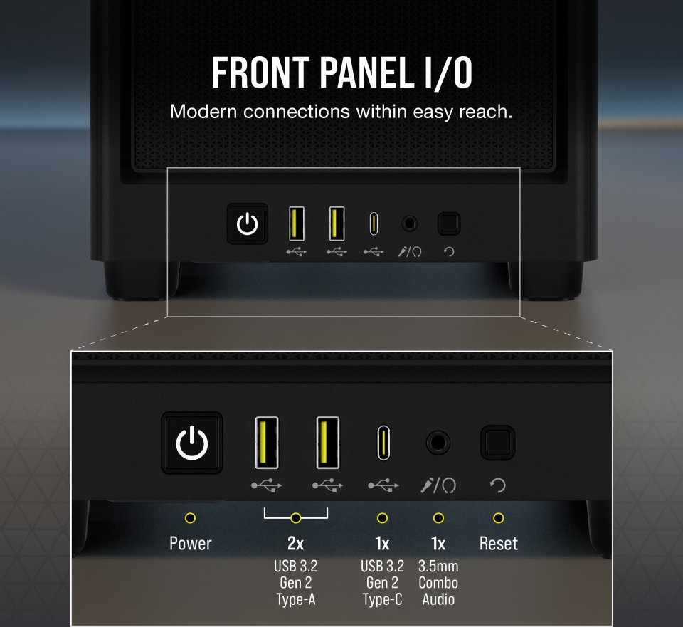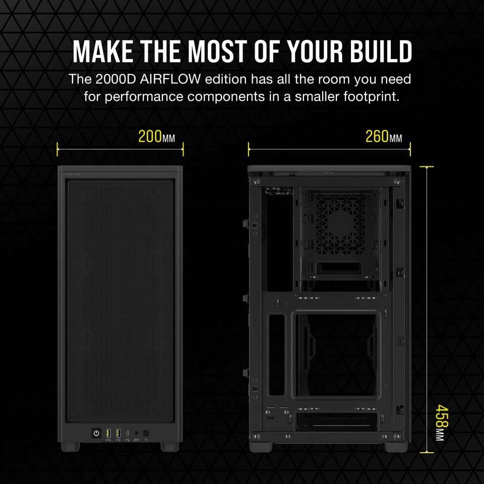 CORSAIR 2000D AIRFLOW on Mini-ITX-kokostandardin mukainen kotelo, jolla on ilmiömäinen jäähdytyskyky rei’itettyjen etu-, sivu- ja takapaneelien ansiosta. Sisätilat on optimoitu jopa 8x 120 mm:n kotelotuulettimelle tai 2x 140 mm tuulettimelle, joten ilmavirtaus pienessäkin tilassa on erinomainen. Kompaktista koostaan huolimatta 2000D AIRFLOW tukee ongelmitta kolmen laajennuspaikan kokoista, jopa 365 mm:n pituista näytönohjainta, joten voit toteuttaa suorituskykyisen järjestelmän jopa kolmella 2,5 tuuman kiintolevyllä. Modernilla, USB Type-C -liitännän sisältävällä etuliitinpaneelilla varustettu 2000D AIRFLOW on pieni ihme koteloksi.