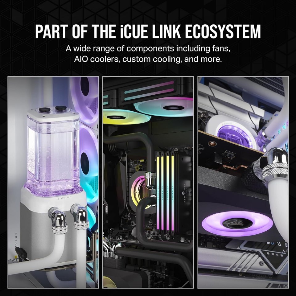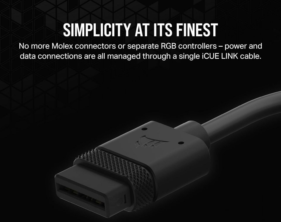 Patenttia odottava iCUE LINK single cable -kaapeliratkaisu virtaviivaistaa rakennusprosessia minimoimalla kaapelisotkua ja varmistaen saumattoman yhteyden muihin iCUE LINK -laitteisiin. Virta- ja datayhteydet hallitaan yhden iCUE LINK -kaapelin kautta, mikä mahdollistaa custom-loop -jäähdytysjärjestelmän rakentamisen minimaalisella kaapeloinnilla. Vanhentuneet Molex-liittimet tai erilliset RGB-ohjaimet ovat historiaa - tervetuloa mukautetun jäähdytyksen tulevaisuuteen!