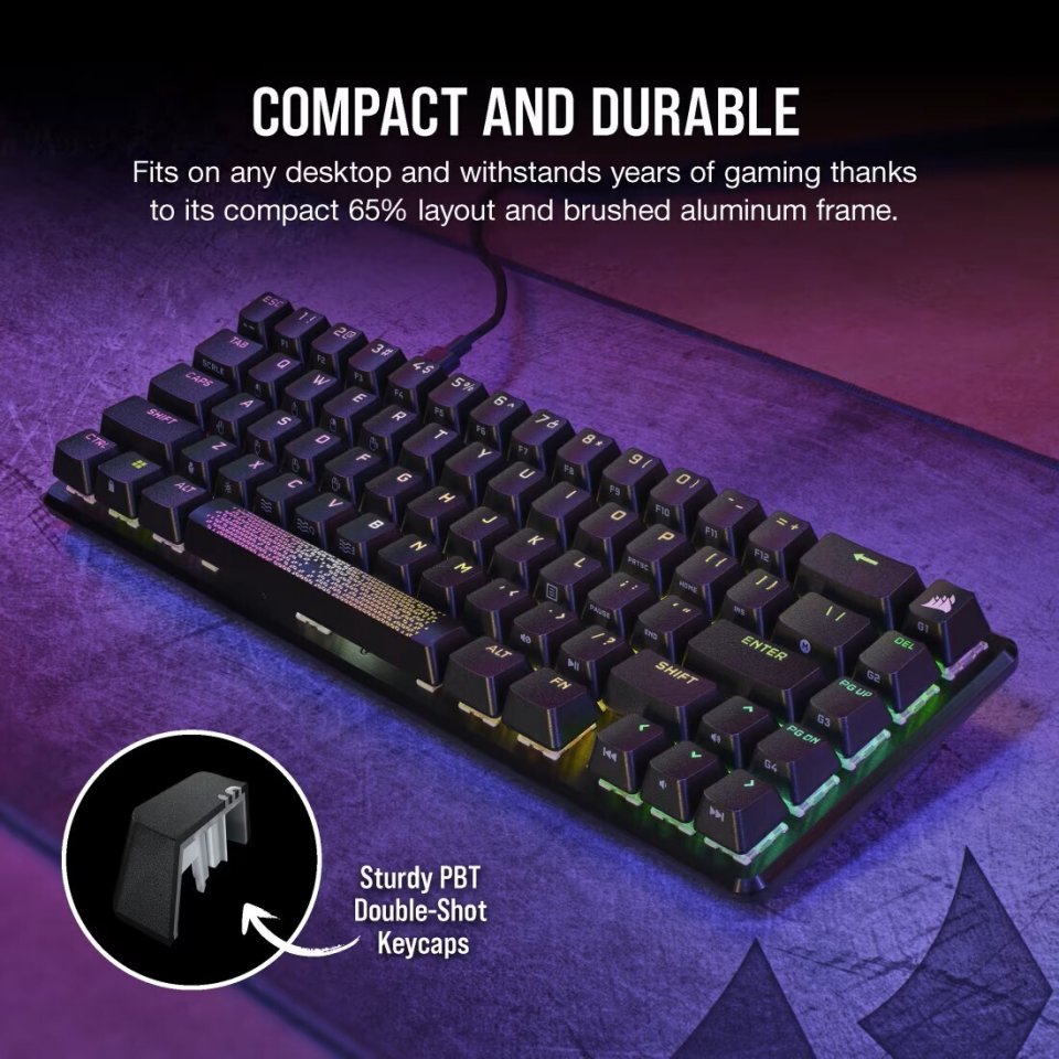 Corsair K65 Pro Mini RGB on 65 % kokoinen optomekaaninen pelinäppäimistö, joka tarjoaa kompaktin koon ilman, että tärkeistä ominaisuuksista tarvitsee tinkiä. Tämä näppäimistö on suunniteltu erityisesti pelaajille, jotka haluavat suorituskykyä ja nopeutta pienessä paketissa. Sen optiset CORSAIR OPX-kytkimet tarjoavat sujuvan ja erittäin nopean vasteen, mikä auttaa keskittymään olennaiseen eli peliin.