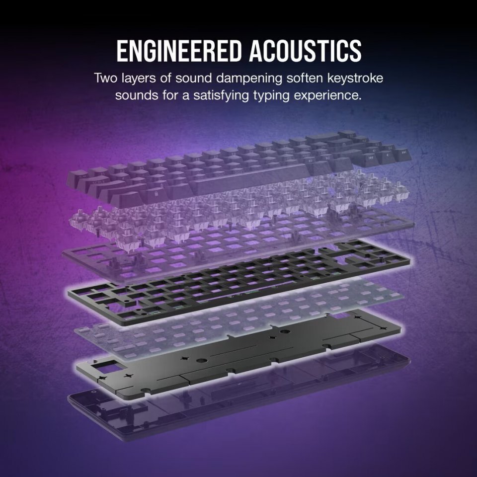 K65 Pro Minin optomekaaniset kytkimet yhdistävät lineaarisen vasteen ja miellyttävän äänen, jonka taustalla on kaksikerroksinen vaimennusratkaisu. Tämä tekee näppäimistön käytöstä sekä nopeaa että miellyttävää, olitpa sitten pelaamassa tai kirjoittamassa.