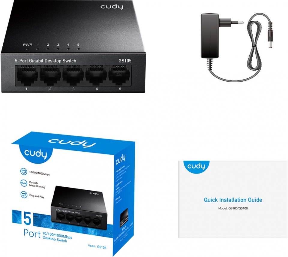 • Myyntipaketin sisältö: Cudy GS105 -5-porttinen kytkin, virtalähde, pikaohje