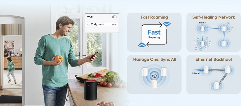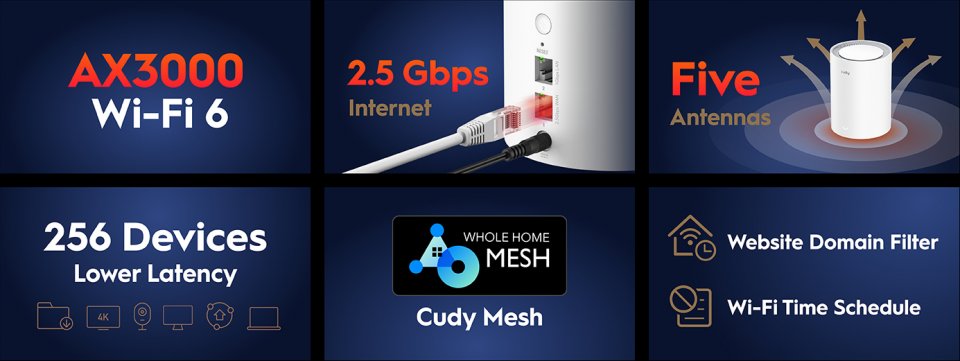 Cudy M3000 WiFi 6 -Mesh-järjestelmä on koko kodin WiFi-ratkaisu, joka pitää verkkosi vahvana kotisi koosta ja rakenteista huolimatta. Järjestelmä käyttää yhtä verkon nimeä ja vaihtaa yhteyttä tukiasemien välillä saumattomasti. Cudy M3000 WiFi 6 -Mesh-järjestelmä tukee jopa 256 yhtä aikaista käyttäjää. Verkon laajentaminen on helppoa, koska kaikki Cudy WiFi Mesh laitteet ovat keskenään yhteensopivia.