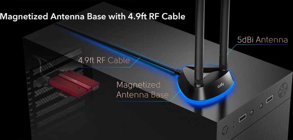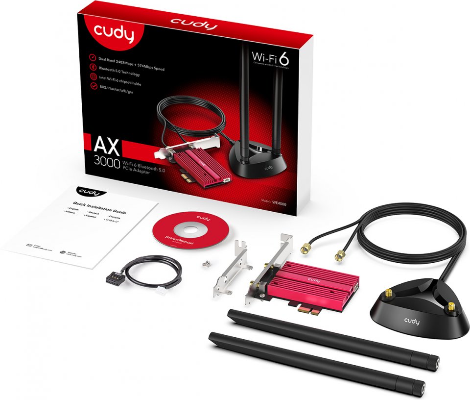 • Pakkauksen sisältö: Cudy WE4000 Tri-band PCI-E-WiFi 6E -adapteri ja Bluetooth 5.2 -sovitin, bluetooth liitäntä kaapeli, magnettinen antennijalka kaapelilla, kaksi 5 dBi antennia, Low Profile -takalevy, pikaohje.