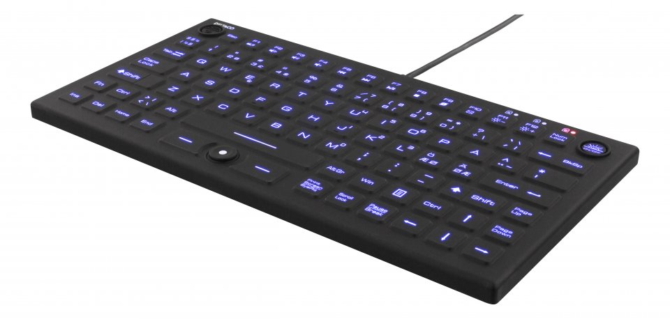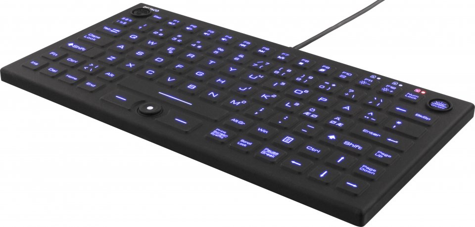 Näppäimistössä on sininen LED-taustavalo, jonka kirkkaustasoa voi säätää neljällä eri asetuksella. Tämä helpottaa kirjoittamista hämärissä tai pimeissä tiloissa ilman, että valaistus häiritsee työskentelyä.