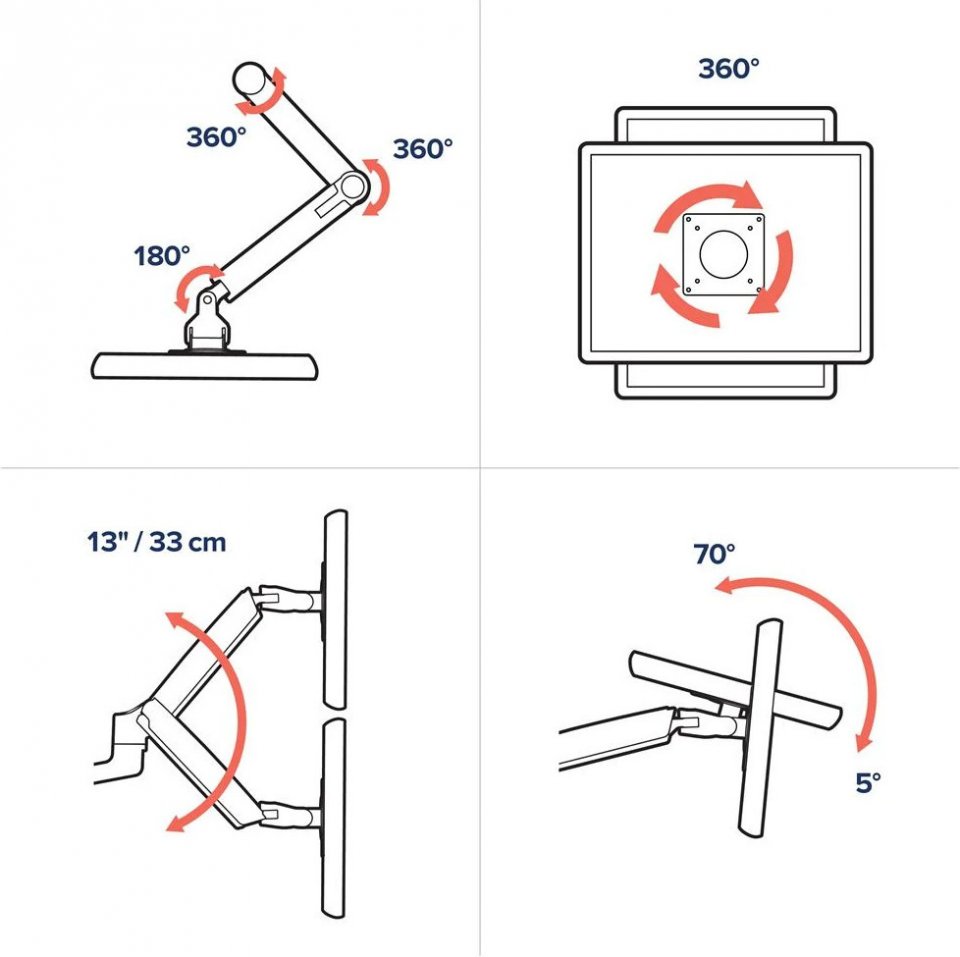 Säädä näytöt työskentelytapasi mukaan. Olipa mielessäsi pystysuora pino tai vierekkäinen asettelu, telineen muotoilu mahdollistaa helpon räätälöinnin, jotta näet näytöt parhaasta kulmasta ja saat pöytätilan tehokkaaseen käyttöön.