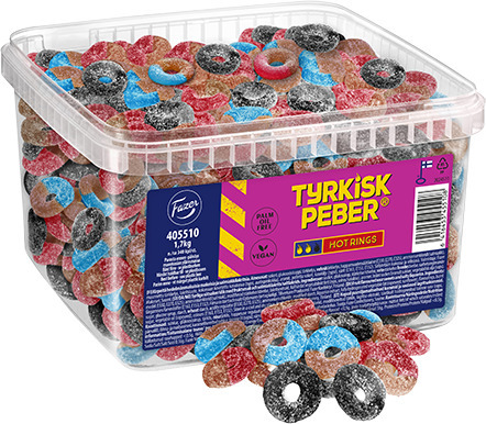 Tyrkisk Peber Hot Rings ei ole kuin mikä tahansa makeinen. Herkkulaatikon kolme erilaista karkkia kutkuttavat makuhermojasi kirpeällä, salmiakkisella ja sopivan tulisella maullaan. Sekoitus sisältää kirpeitä hedelmä-lakritsin makuisia renkaita ja suolaisia salmiakkirenkaita – tutulla Tyrkisk Peberin ärhäkällä potkulla! Vegaaninen.