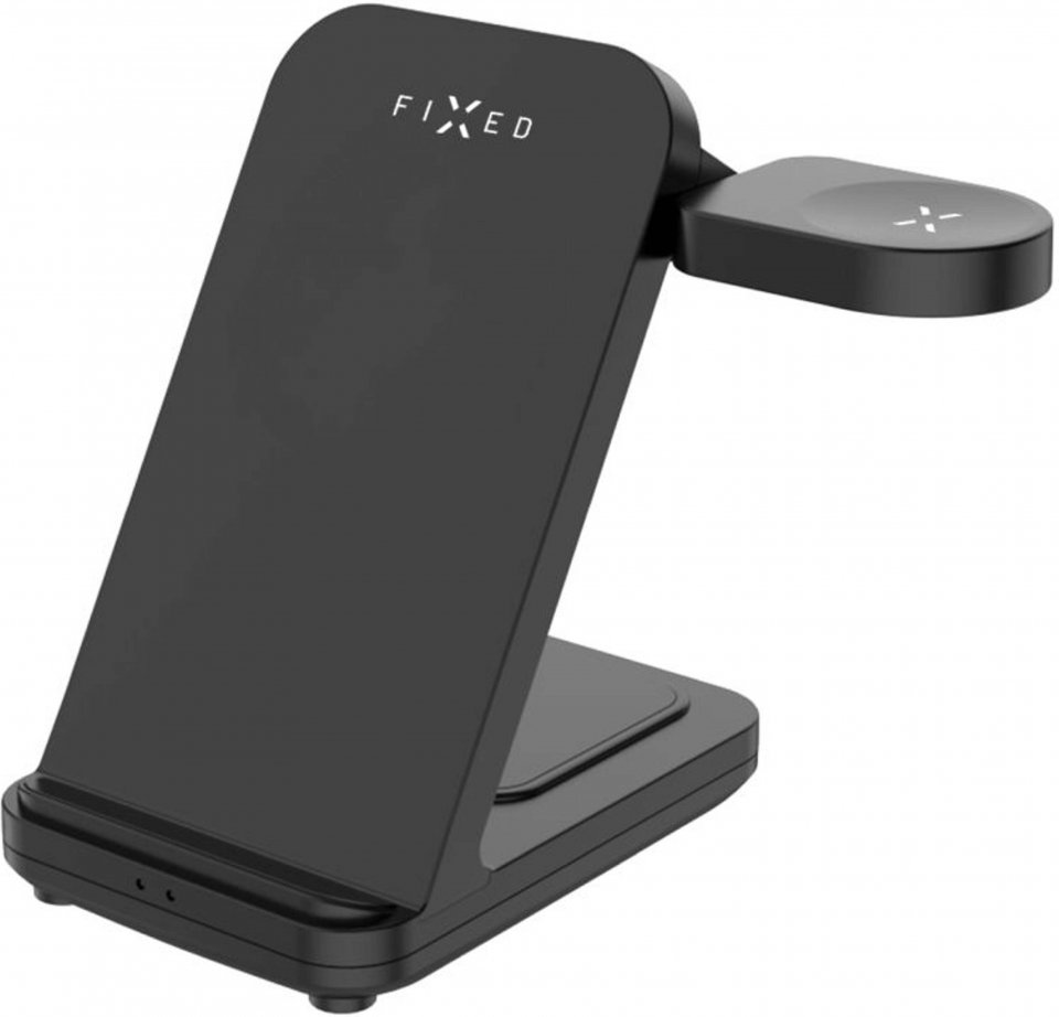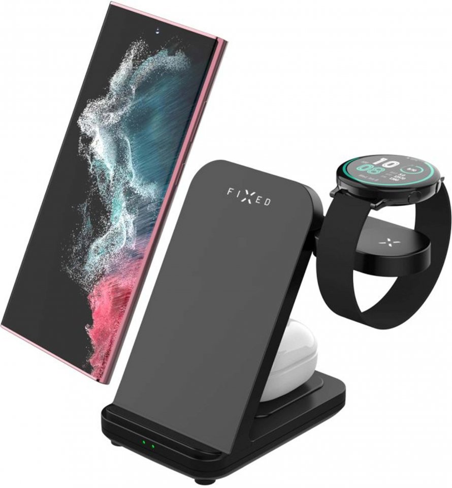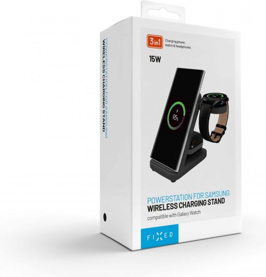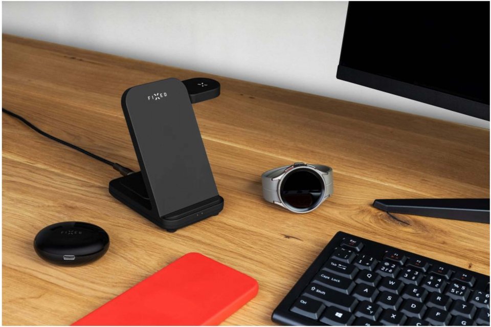 FIXED 3-in-1 langaton latausasema tarjoaa kätevän tavan ladata useita laitteita samanaikaisesti ilman johtoja. Tämä musta latausasema on suunniteltu erityisesti Samsung-laitteille, ja siinä on kolme latauspintaa: puhelimelle, langattomille kuulokkeille tai toiselle puhelimelle sekä Samsung Galaxy Watch -älykellolle. Latausasema tukee pysty- ja vaakasuuntaista latausta, ja sen LED-valo kertoo latauksen tilan selkeästi.