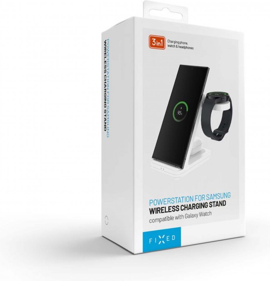 FIXED 3-in-1 langaton latausasema tarjoaa kätevän tavan ladata useita laitteita samanaikaisesti ilman johtoja. Tämä musta latausasema on suunniteltu erityisesti Samsung-laitteille, ja siinä on kolme latauspintaa: puhelimelle, langattomille kuulokkeille tai toiselle puhelimelle sekä Samsung Galaxy Watch -älykellolle. Latausasema tukee pysty- ja vaakasuuntaista latausta, ja sen LED-valo kertoo latauksen tilan selkeästi.