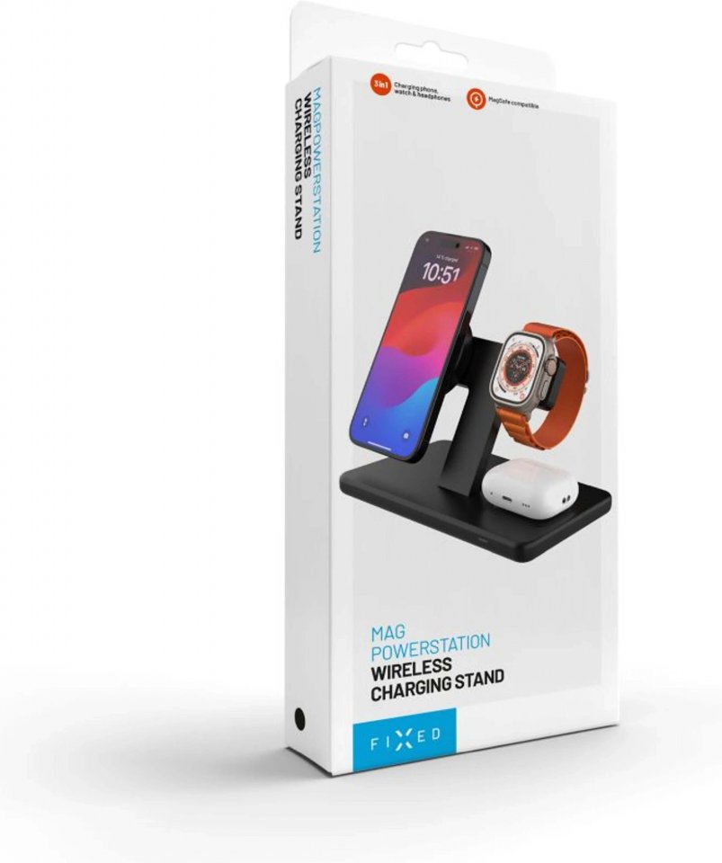 FIXED 3-in-1 langaton MagPowerstation-latausasema on suunniteltu erityisesti Apple-laitteiden nopeaan ja kätevään lataamiseen. Se yhdistää MagSafe-yhteensopivan iPhonen, Apple Watchin ja langattomat kuulokkeet yhteen tyylikkääseen ja kompaktin kokoiseen laitteeseen, joka sopii niin työpöydälle kuin yöpöydällekin.