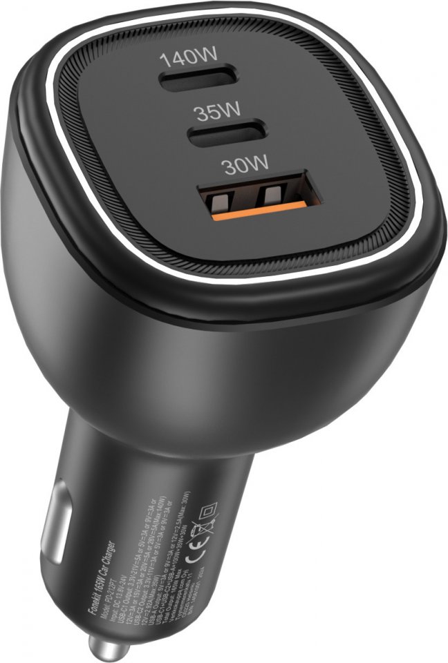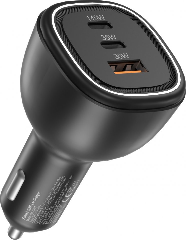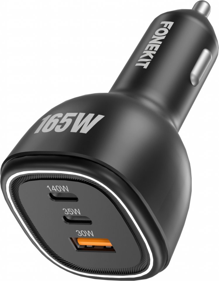 Erittäin tehokkaasta FoneKit Travel 165 W -autolaturista löytyy kaksi USB-C-porttia ja yksi USB-A-portti. USB-C1-portti tarjoaa jopa 140 W tehoa, joten pikalatausta tukevat laitteet latautuvat sillä erittäin nopeasti. USB-C2-portti taas tarjoaa 35 W tehoa ja USB-A-portti 30 W. Älykkään PPS-latauksen ansiosta voit jopa ladata yhtä runsaasti virtaa kuluttavaa kannettavaa tietokonetta ja yhtä mobiililaitetta samaan aikaan.