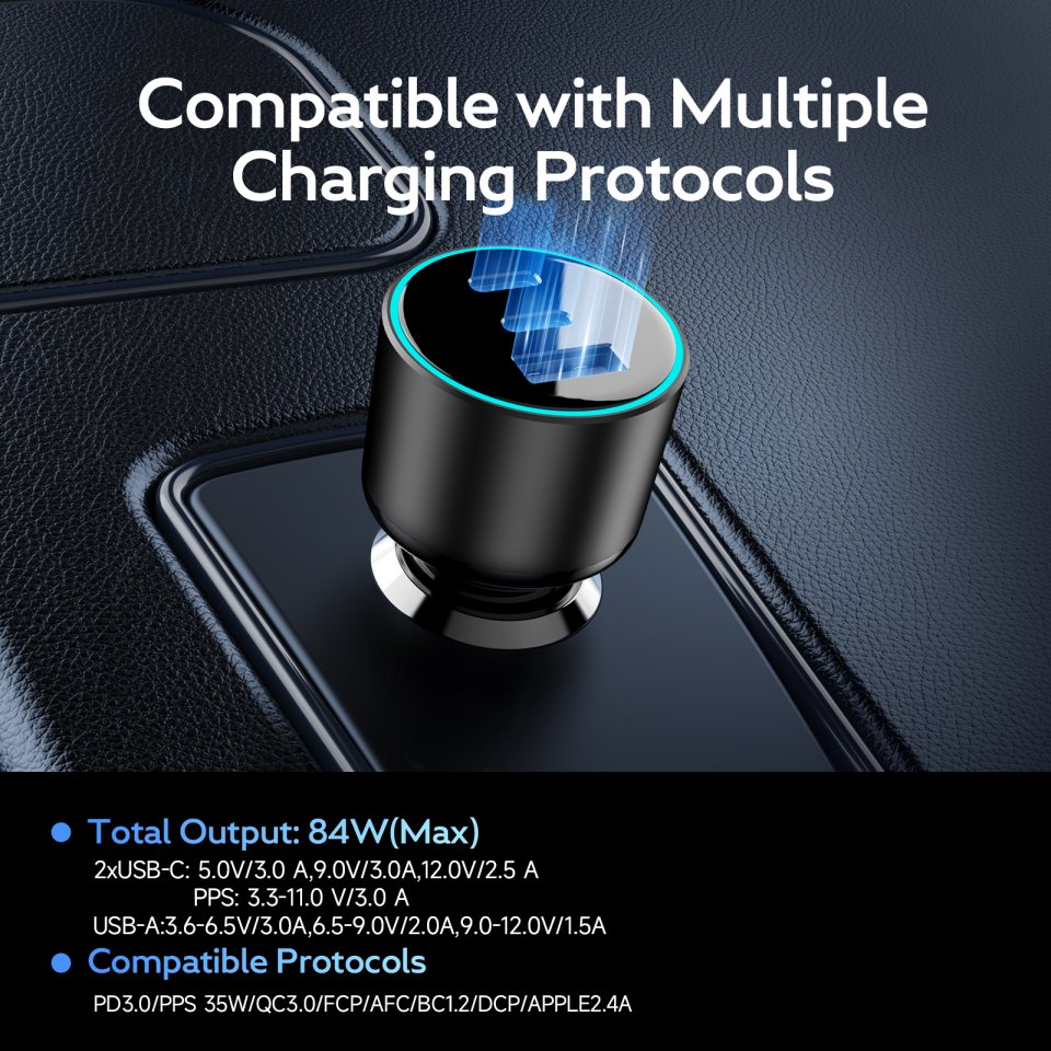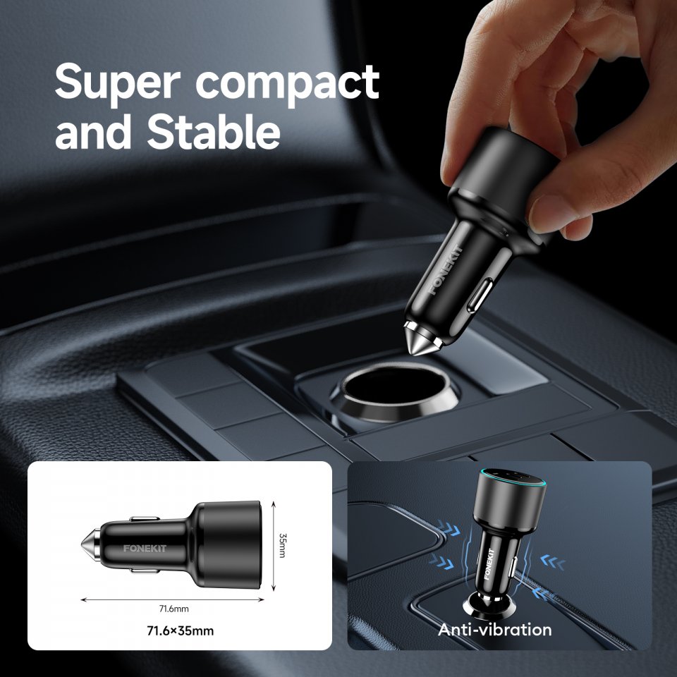 FoneKit Travel 84W autolaturista löytyy runsaasti tehoa ja kattavat liitännät. Sen kahden USB-C-portin ja yhden USB-A-portin ansiosta latauspaikat eivät lopu kesken autossasi. USB-C-portit tarjoavat jopa 33W tehoa, joten PD-pikalatausta tukevat laitteet latautuvat sillä erittäin nopeasti, ja USB-A-portti taas tarjoaa 18W tehoa. Älykkään PPS-latauksen ansiosta voit jopa ladata yhtä runsaasti virtaa kuluttavaa kannettavaa tietokonetta ja yhtä mobiililaitetta samaan aikaan. FoneKit Travel 84W autolaturi sopii siis erinomaisesti autoon kuin autoon.