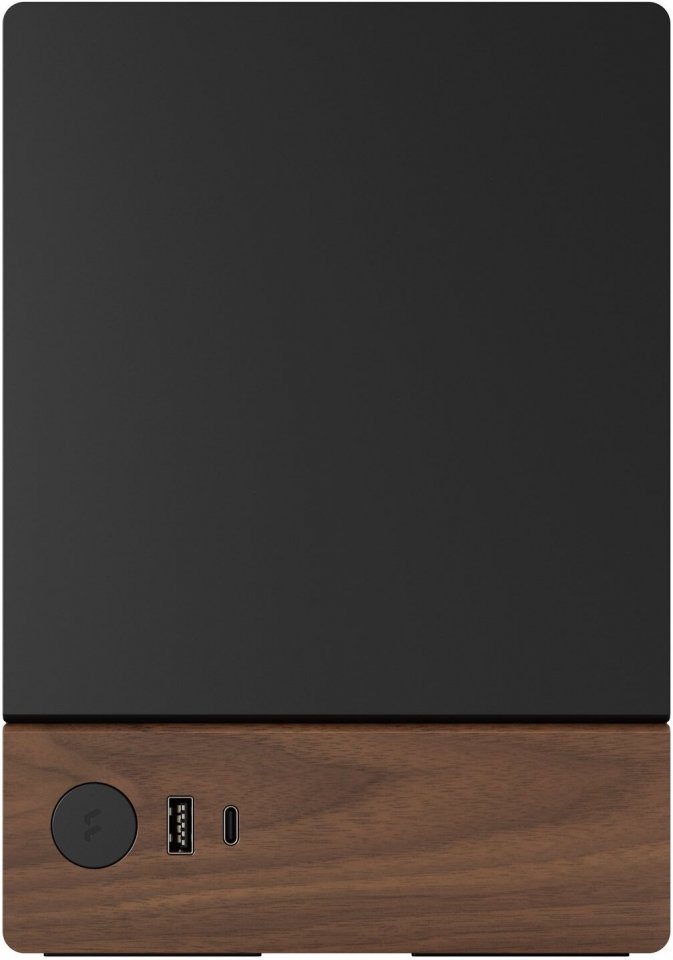 Etupaneeli sisältää alumiinisen virtapainikkeen ja kaksi USB-porttia laitteiden liittämistä varten, mukaan lukien yksi USB Type-C 20 Gbps -portti.