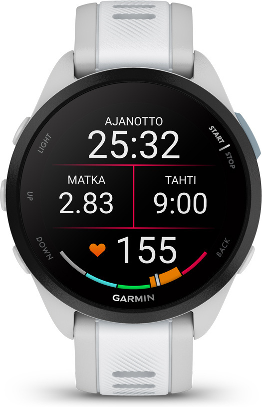 Siitä vaan - ilmottaudu kilpailuun ja harjoittele fiksusti helppokäyttöisen Forerunner® 165 Music -GPS-juoksuälykellon avulla. Se antaa tarkat tahti-, matka- ja syketiedot, ja näet edistymisesi selkeästi kellon AMOLED-kosketusnäytössä. Garmin-valmentaja ja mukautettavat kisaharjoitusohjelmat auttavat sinua pyrkimään tavoitteisiisi. Aamuraportista näet terveystietoja, kuten yleiskatsauksen nukkumisestasi, palautumisestasi ja harjoittelustasi. Harjoitusvaikutuksesta ja harjoitusvaikutusmerkinnöistä näet, miten harjoituksesi vaikuttavat kuntoosi, ja tiedostat ensisijaisen harjoituksesta saamasi edun. Sen jälkeen voit tarkistaa palautumisajasta, miten pitkään sinun kannattaa ottaa rauhallisesti juoksukertojen välillä. Sisäisen musiikin tallennustilan ansiosta voit kuunnella ilman puhelinta ja antaa rytmin kannustaa sinua entistä kovempiin suorituksiin. Kun pariliität kellon älypuhelimeesi, näet ilmoitukset suoraan kellossa. Saat hyvän kokonaiskuvan terveydentilastasi Forerunner® 165 Music -älykellostasi, jonka akunkesto on jopa 11 päivää älykellotilassa.