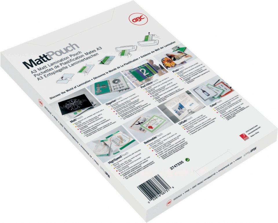 Kätevä, jokapäiväinen ratkaisu suojata ja korostaa esityssivuja, tuotesivuja, kuvia, merkkejä jne. Mattapinnalle on helppo kirjoittaa ja se vähentää häikäisyä. Soveltuu erityisen hyvin ulkokäyttöön. Täydellinen kaikille laminointilaitteille.
