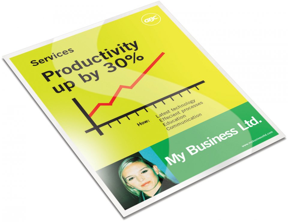 GBC HighSpeed A4 -laminointitasku on käytännöllinen ja päivittäinen ratkaisu erilaisten asiakirjojen, kuten esitysten, hinnastojen, tuotesivujen, valokuvien ja sertifikaattien suojaamiseen ja korostamiseen. HighSpeed A4 -laminointitasku syötetään pitkä sivu edellä A3-kokoiseen laminointilaitteeseen ja näin saavutetaan 30% nopeampi laminointiaika. Hyödylliset kohdistusoppaat, mikronikuvakkeet ja syöttösuuntanuolet takaavat täydellisen lopputuloksen. Täydellinen, kun aika ratkaisee!