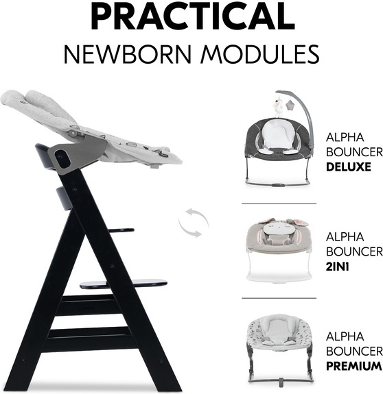 Vinkki! Yhdessä Hauck Alpha Bouncer 2 in 1 -sitterin kanssa voit käyttää Alpha + -syöttötuolia vauvallesi vastasyntyneestä, eikä vasta 6 kuukauden ikäisestä lähtien.