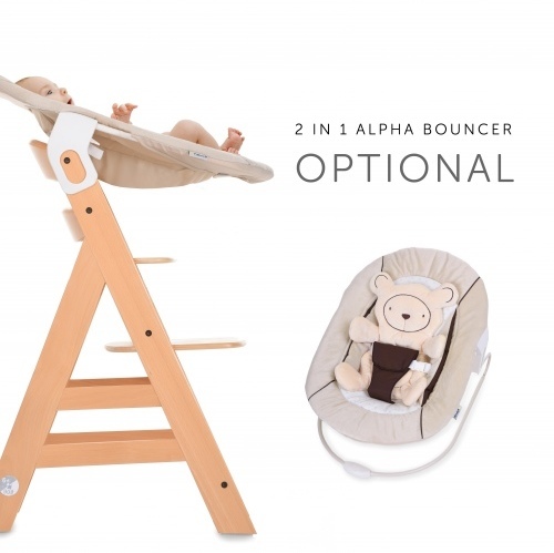 Hauck Alpha+ -syöttötuoli on ideaali kumppani koko lapsuusajaksi! Puinen syöttötuoli kasvaa lapsesi mukana ja mukautuu muuttuviin tarpeisiin. Tuolissa 5-pistevaljaat pitävät pienen istujan turvallisesti paikallaan. Kestää jopa hämmästyttävän 90 kilon painon normaalina tuolina. Puhdista pyyhkäisemällä ja jatka käyttöä. Vinkki! Yhdessä Hauck Alpha Bouncer 2 in 1 -sitterin kanssa voit käyttää Alpha + -syöttötuolia vauvallesi vastasyntyneestä, eikä vasta 6 kuukauden ikäisestä lähtien.