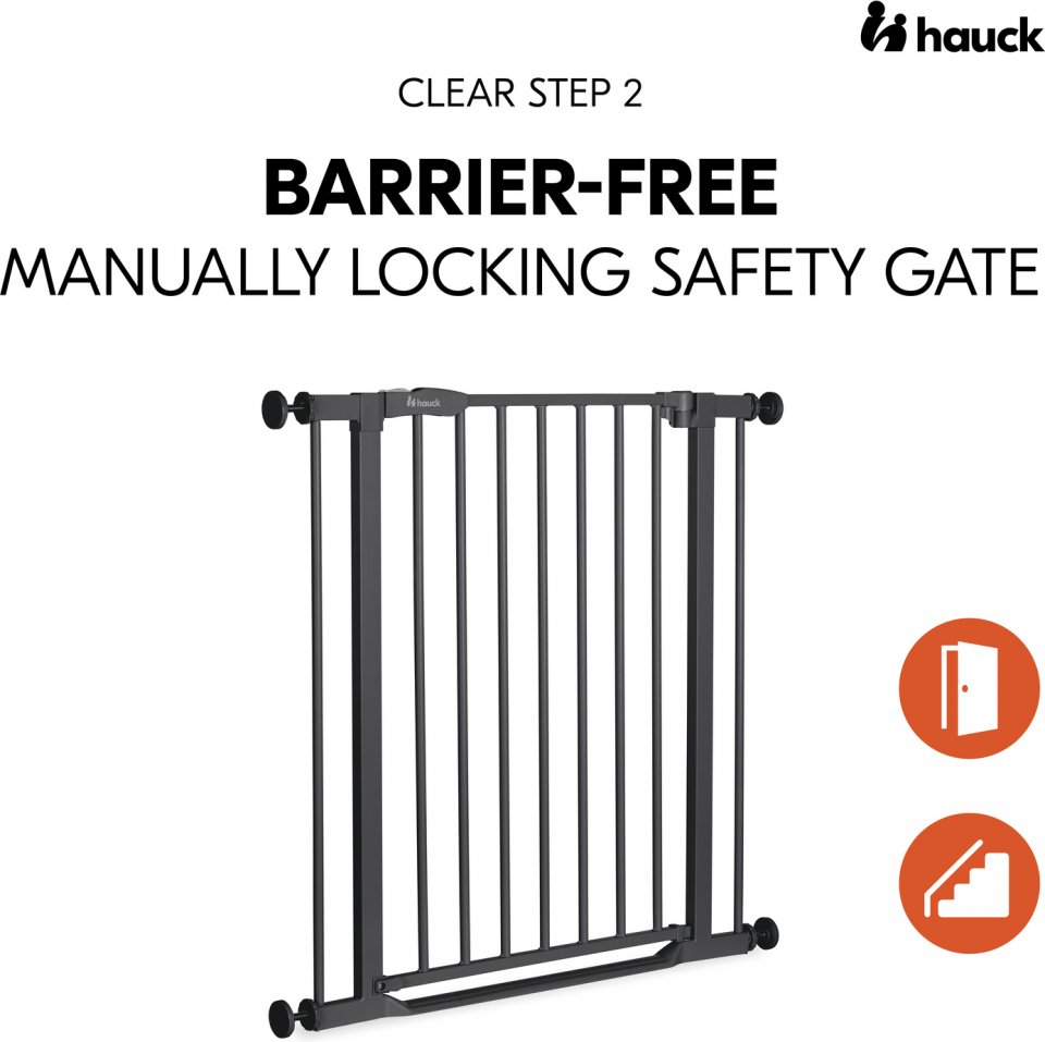 Turvallisuutta lapsiperheeseen Hauck Clear Step 2 -turvaportin avulla. Lähes kynnyksettömästä portista on helppo astella myös pienillä jaloilla kompastumatta. Nopeasti asennettavalla turvaportilla estät liikkumisen huoneisiin tai portaisiin. Portti avautuu yhdellä kädellä helposti molempiin suuntiin, mutta integroidulla hakasella estää avaaminen vain toiselta puolta. Mahdollisuus pidentää enintään kahdella jatkopalalla. Materiaalina kestävä teräs. Voidaan asentaa Y-palojen (lisävaruste) avulla myös portaikkojen pyöreisiin puoliin.