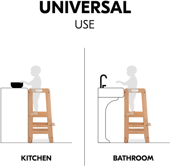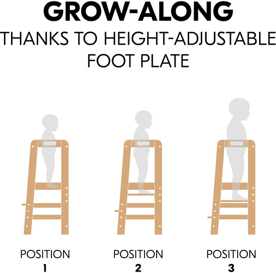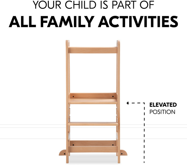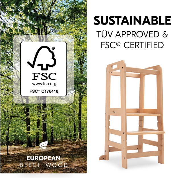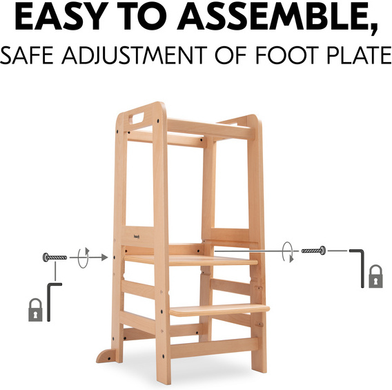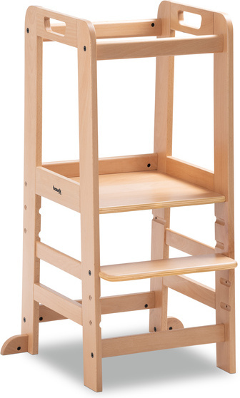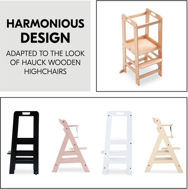 Tukeva Hauck Learn N Explore -seisontajakkara nostaa pinokaisen samalle tasolle aikuisten kanssa, jolloin yhdessä leipominen tai askartelu onnistuu turvallisemmin pyödän ääressä seisten. FSC-sertifioidusta pyökkipuusta valmistettu jakkara ei heilu edes sivusuuntaisesti ulkonevien siivekkeiden ansiosta. Jakkaralle on helppo ja itsenäinen pääsy korkeussäädettävän seisontatason ja rappusen ansiosta. Pienillä käsillä voi pitää kiinni erillisistä kädensijoista ja etu- ja selkäpuolen turvakaaret pitävät innostuneen heilujan paikoillaan jakkaran keskellä.