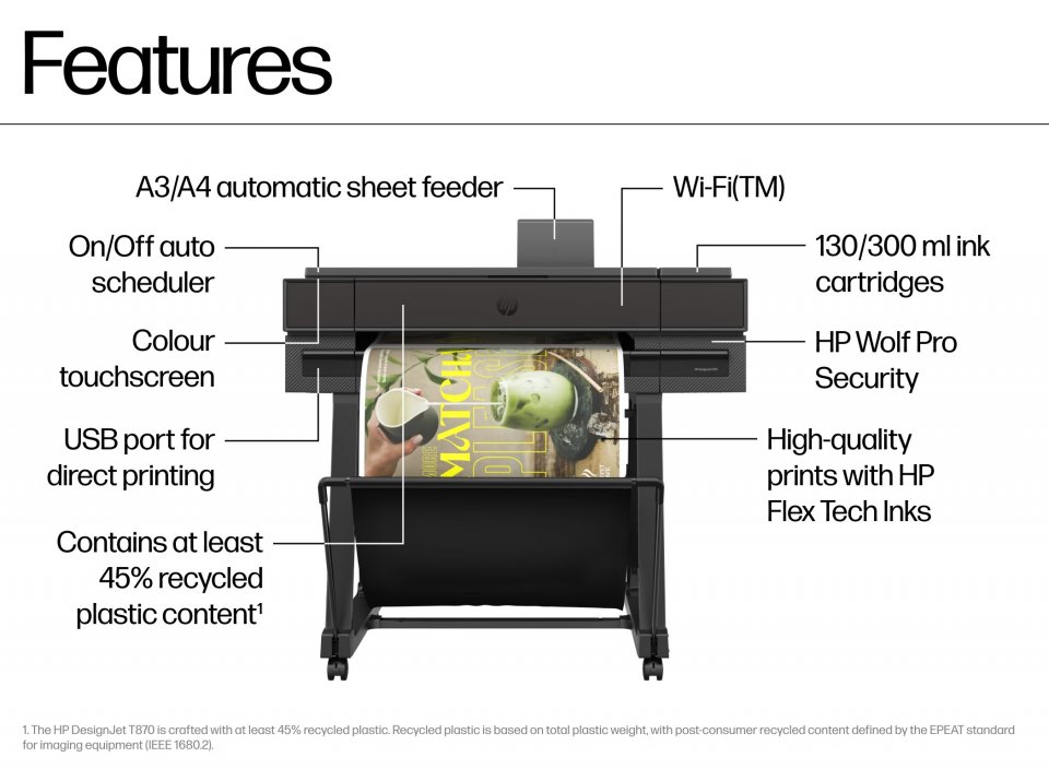 HP DesignJet T870 on suunniteltu tarjoamaan luotettavaa ja monipuolista suurkokotulostusta jopa 61 cm leveydellä. Se sopii hyvin yrityskäyttöön, jossa tarvitaan tarkkaa ja nopeaa tulostusta esimerkiksi teknisille piirustuksille, mainosmateriaaleille tai valokuville. Tulostimen helppokäyttöisyys, useat liitäntämahdollisuudet ja laadukas värintoisto tekevät siitä käytännöllisen työkalun erilaisiin tulostustarpeisiin.