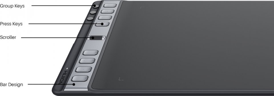 Huion on ensimmäistä kertaa lisännyt Inspiroy 2:een kolme Group Keys -painiketta. Tästä syystä painikkeita voidaan laajentaa 8:sta 24:ään, mikä lisää sovelluksen toimintoja ja yksinkertaistaa työnkulkua huomattavasti. Tämän lisäksi voit mukauttaa painikkeita ohjaimen kautta. Voit nähdä jokaisen näppäimen toiminnon Press Keys View -käyttöliittymässä ilman ulkoa opettelemista.