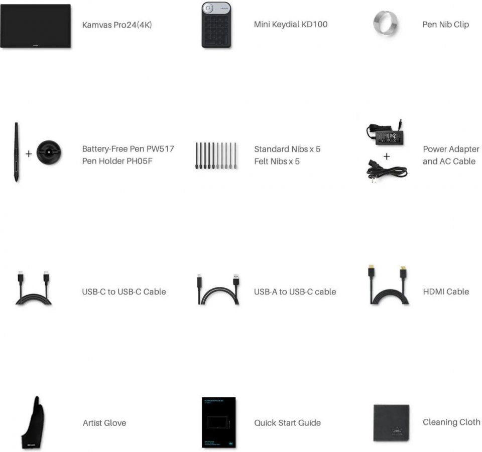 • Pakkauksessa mukana: Piirtonäyttö, Keydial Mini -ohjelmoitava näppäimistö, PW517-kynä, PH05F-kynäteline, vaihtokärjet 10kpl, virtalähde, HDMI-kaapeli, USB-C-USB-C-kaapeli, USB-C-USB-A-kaapeli, piirtokäsine ja puhdistusliina