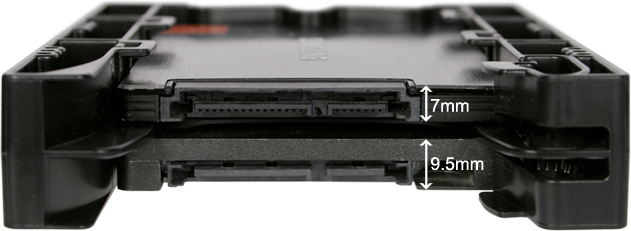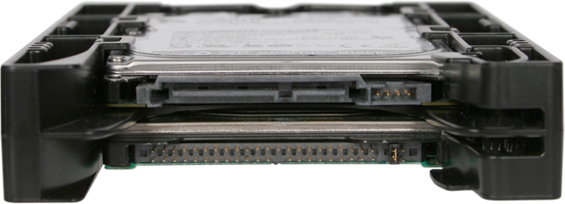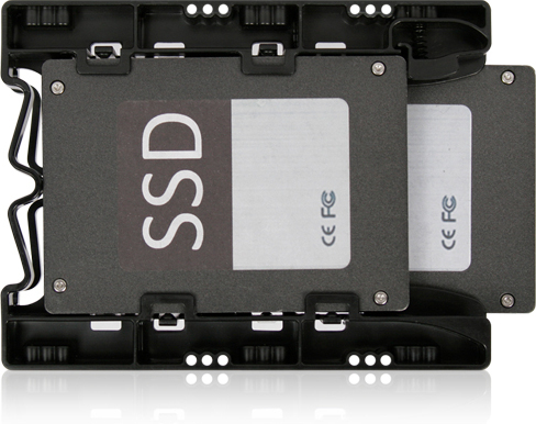 Asennuskehikko, jonka avulla asennat kaksi 2,5" SSD-levyä yhtään 3,5" asemapaikkaan. Kiinnitys koteloon tai kelkkaan alta, päältä tai sivuista.