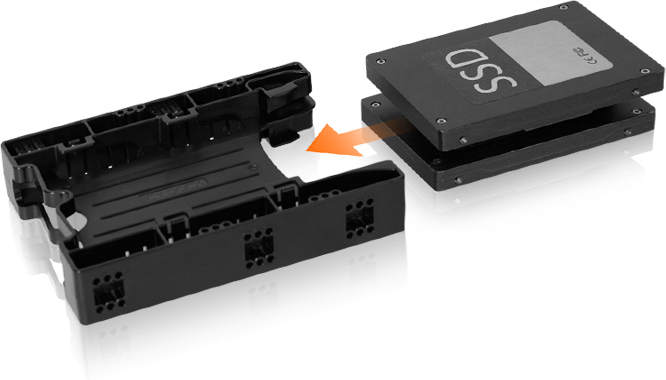 Asennuskehikko, jonka avulla asennat kaksi 2,5″ SSD-levyä yhtään 3,5″ asemapaikkaan. Kiinnitys koteloon tai kelkkaan alta, päältä tai sivuista.