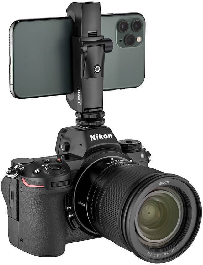 Joby GripTight Smart -älypuhelinpidikkeellä saat kiinnitettyä puhelimesi kamerajalustaan, jossa on 1/4" jalustakierre.