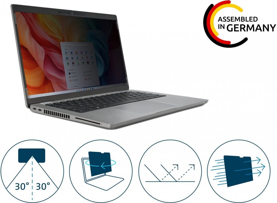 Rajoitettu noin 30 asteen katselukulma pitää näytön sisällön selkeänä vain suoraan edestä katsottuna. Sivulta katsottuna näkymä tummuu, mikä ehkäisee tehokkaasti ohikulkijoiden mahdollisuutta nähdä luottamuksellista tietoa. Tämä lisää tietoturvaa liikkeellä ollessa ja avoimissa työtiloissa.