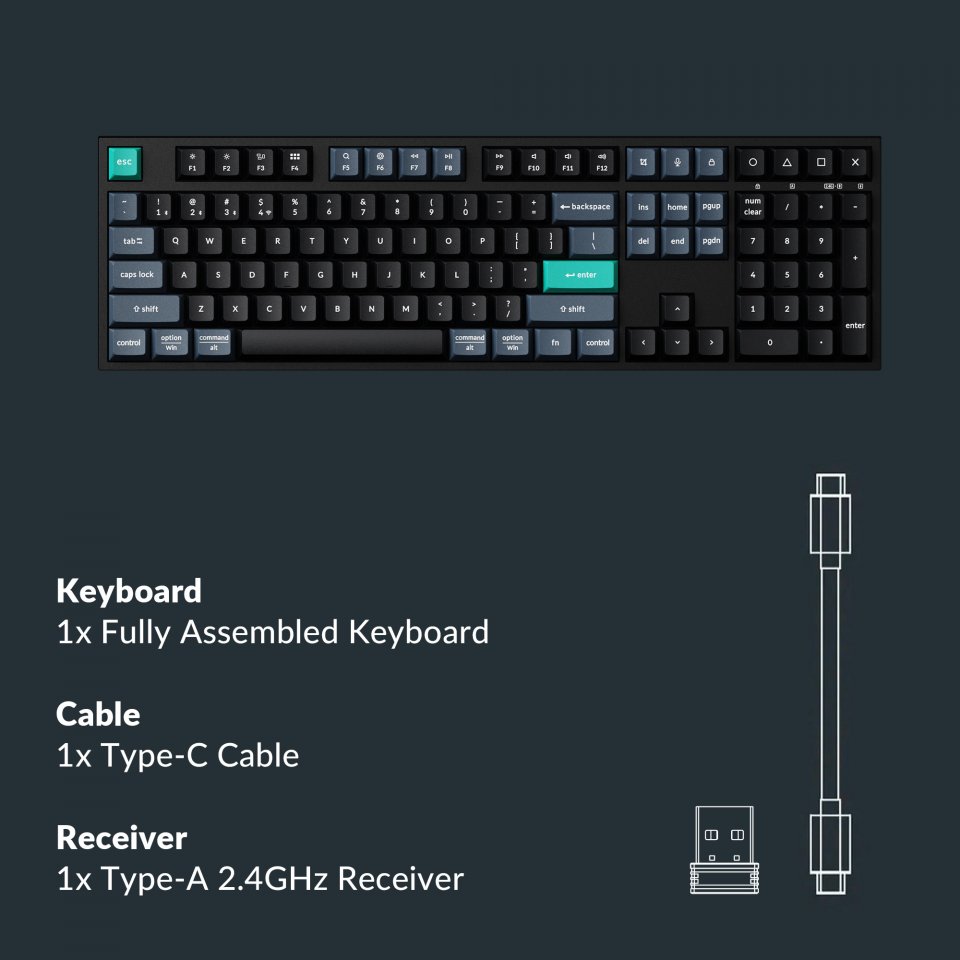 Mukana tuleva 2,4 GHz Type‑A ‑vastaanotin toimii heti käyttöön otettaessa. Kun et tarvitse sitä, säilytä dongle kätevästi näppäimistön oikean yläkulman magneettipaikassa.