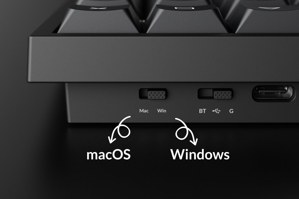 B36:ssa on lisäksi fyysinen järjestelmäkytkin, jolla vaihdat nopeasti Windows- ja macOS‑näppäinkarttojen välillä. Eri näppäinasettelut voidaan myös määrittää suoraan Launcherissa.