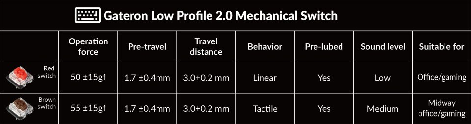 • Kytkimet: Gateron Brown low-profile, matalaprofiiliset ruskeat kytkimet