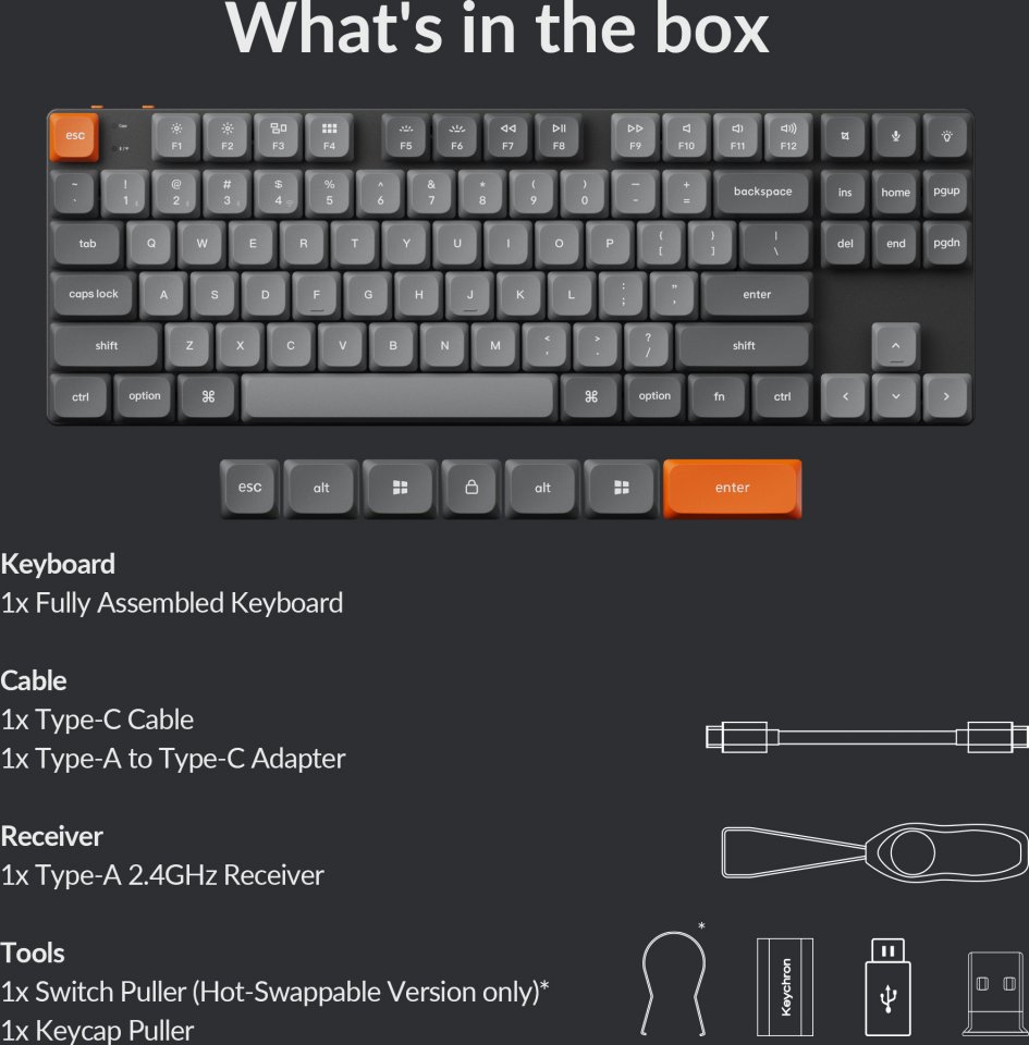 • Pakkauksessa: Näppäimistö, näppäinhattujen ja kytkinten irrotustyökalu, USB-C - USB-A -kaapeli, USB-dongle, vastaanottimen jatkopala