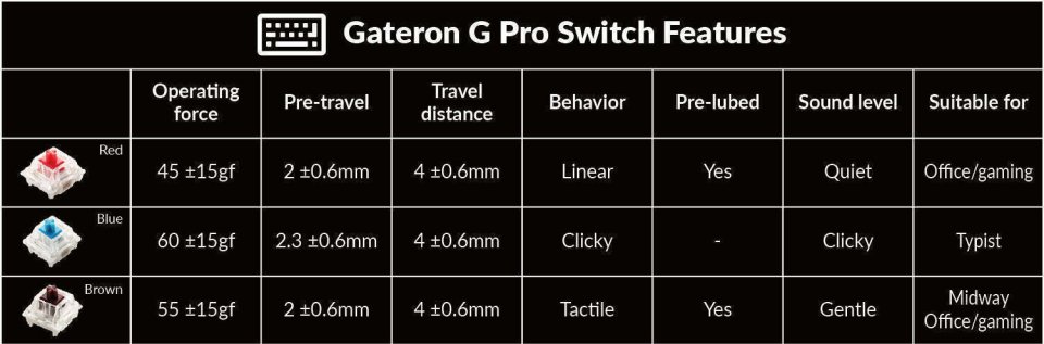Esivoideltu Gateron G Pro -kytkin Optimoitu G Pro -kytkimen muotti heiluu vähemmän kuin tavallinen mekaaninen kytkin ja tuntuu pehmeämmältä jokaisella painalluksella. Lisäksi kaikkien Gateron G Pro -kytkimien (lukuun ottamatta naksuvia Clicky-kytkimiä) tehdasvalmisteinen esivoitelu takaa parhaan pehmeyden kirjoittaessa.