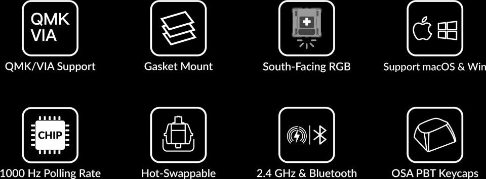 • Pakkauksessa: Valmiiksi koottu näppäimistö kytkimillä ja näppäinhatuilla, työkalut (kytkimien irroittaja, näppäinhattujen irroittaja, ruuvimeisseli, kuusioavain), 1 x Type-C – Type-C kaapeli, 1 x Type-A – Type-C sovitin, 1 x Type-A USB-dongle, 1 x Type-C USB-dongle