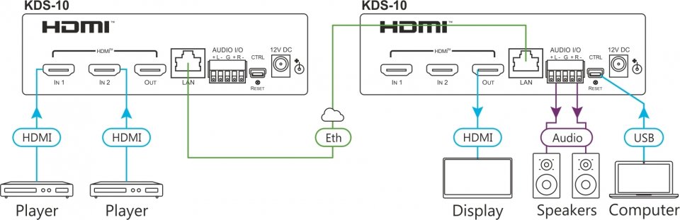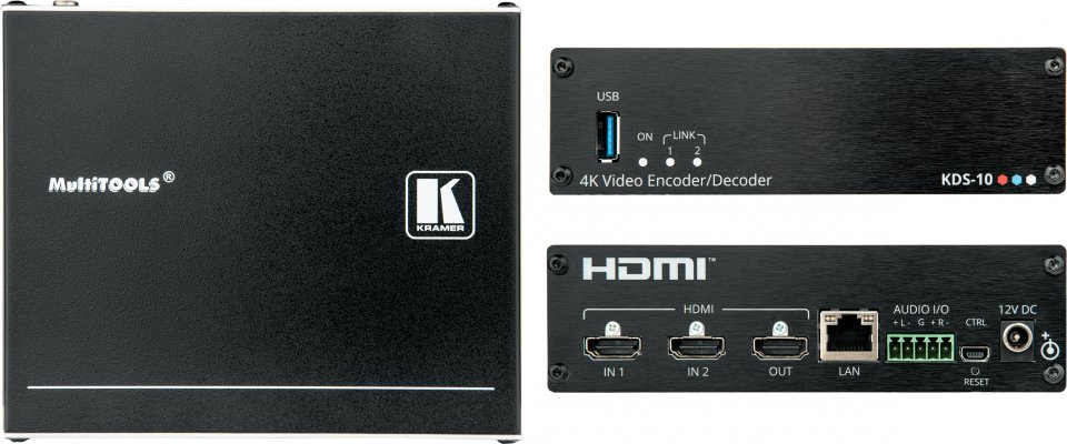 KDS-10 on edistyksellinen lähetin/vastaanotin videosignaalien suoratoistoon Ethernetin kautta kuparikaapelilla. Suoratoistaa jopa 4K@60Hz (4:4:4) kun käytössä on yksi lähde, 4K@30Hz (4:2:0) kun suoratoistetaan kahta lähdettä.