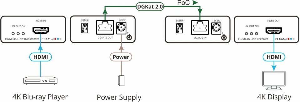 HDMI-lähetin/vastaanotinpari vaativiin asennuksiin. Kramerin omalla DGKat2.0 teknologialla voit siirtää HDMI-signaalia 4K:a jopa 70 metriin asti. Asennusta helpottaa laitteiden kompaktikoko sekä virransyöttö laitteelta toiselle (vain toinen laitaa tarvitsee virtalähteen).