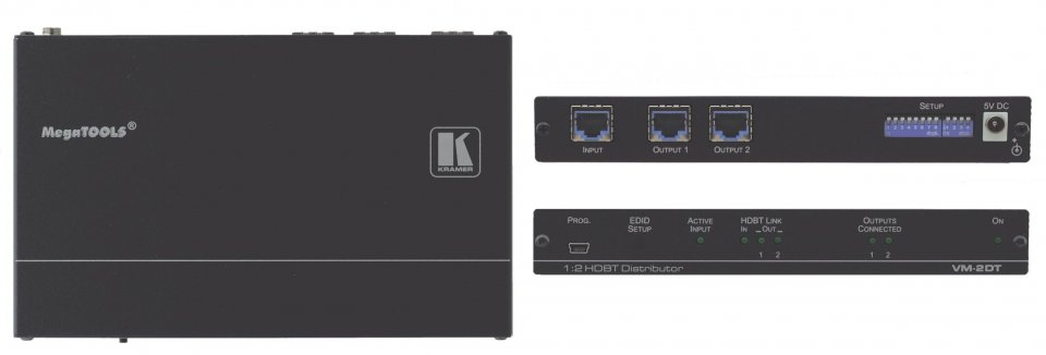 VM-2DT on laadukas pitkän kantaman 4K@60Hz (4:2:0) HDBaseT-jakovahvistin. Laite jakaa yhden HDBaseT-sisääntulon, tasoittaa ja uudelleen kellottaa signaalin jakaen sen kahteen identtiseen HDBaseT-ulostuloon.
