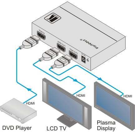 Kramer Equalization & re–Klocking -tekniikka – Yhden HDMI-sisääntulon kautta laite tasoittaa ja uudelleen kellottaa signaalin jakaen sen kahteen identtiseen lähtöön.