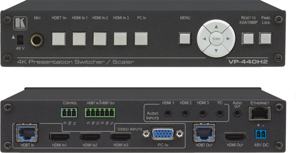 VP-440H2 on tehokas 4K@60Hz (4:4:4) esitysvalitsin/kytkin skaalaimella, jossa on yksi HDBaseT/POE-liitäntä, kolme HDMI-liitäntää ja yksi VGA-liitäntä. Laite skaalaa videon, upottaa äänen ja antaa signaalin HDMI- ja HDBaseT-lähtöön samanaikaisesti. Laitteessa on analogiset äänitulot ja -lähdöt.
