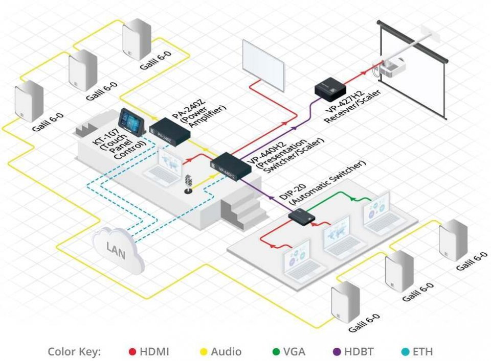 • Sisääntulot: 3 x HDMI, 1 x VGA, 1 x HDBT (RJ45), 1 x 3.5 mm mini jack, 1 x 6.3 mm jack