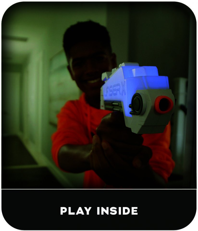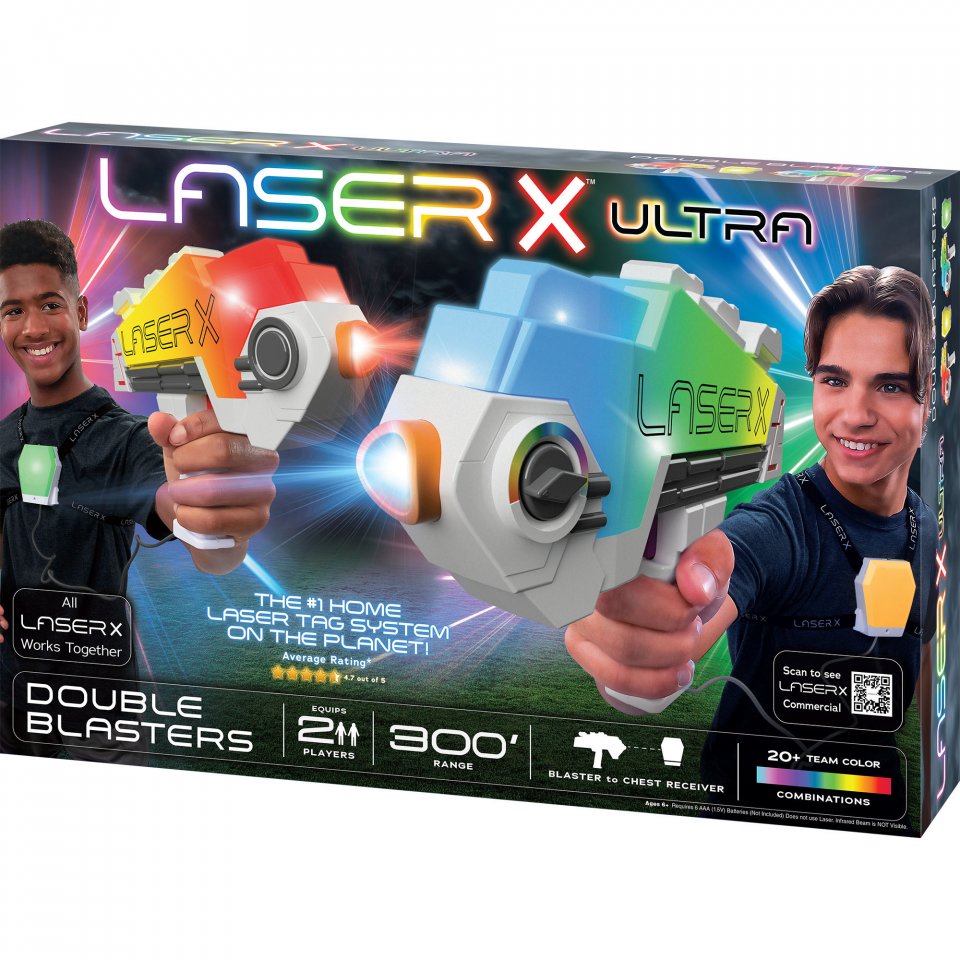 Laser X Ultra Double Blastersissa on nopea lataus ja rintavastaanottimessa on ilmaisimet, jotka kertovat, kuka osui sinuun! Blaster-lasersäteet (infrapunavalo) kulkevat ikkunoiden läpi ja voivat heijastua seinistä ja peileistä osuakseen vastustajiin. Kaikki Laser X -laitteiden tuotteet toimivat yhdessä. Pelissä voi olla rajaton määrä pelaajia. Joten! Liity joukkueeseen ja aloita hauska kamppailupeli.
