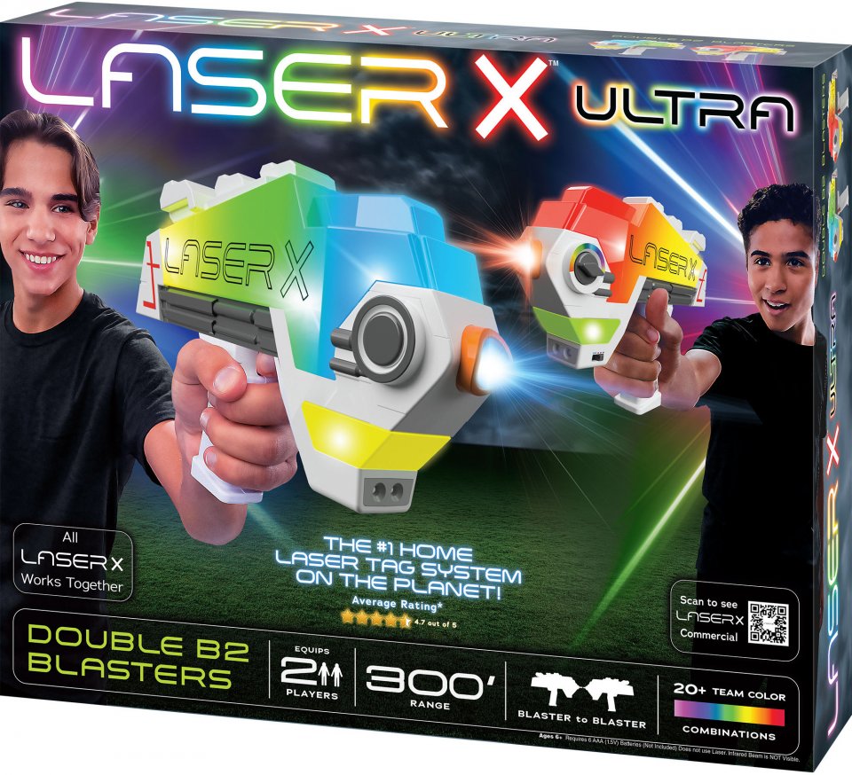 Superhienot pyssyt valolla ja äänellä! Ultra Blasterit voivat ampua jopa 90 metrin päähän! Joten valmistaudu ampumaan ja osumaan vastustajiisi. Ultra Blasterit toimivat sekä sisä- että ulkokäytössä – pimeässä tai kirkkaassa auringonvalossa. Voit valita yli 20 eri joukkueenväriyhdistelmää tai Ultra-tilassa vaihtaa niiden välillä! Laser X Ultra Blaster-to-Blasterissa on nopea lataus ja sisäänrakennetut ilmaisimet, jotka kertovat, kuka osui sinuun! Blaster-laserit (infrapunavalo) menevät ikkunoiden läpi ja heijastuvat seinistä ja peileistä osuakseen vastustajiin. Kaikki Laser X -tuotteet toimivat yhdessä. Pelissä voi olla rajaton määrä pelaajia, joten kokoa tiimi ja aloita hauskanpito.